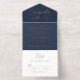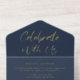 Elegant dark blue elopement or private wedding announcement and reception all-in-one invitation featuring "Celebrate With Us" in a chic script and your marriage announcement and reception invitation, all rendered in your choice of genuine gold, silver or rose gold foil. A white tear-away RSVP postcard provides a convenient and envelope-free response option for your guests.