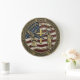 This magnificent round wall clock is a grand tribute to American history and faith, featuring a sophisticated 3D-style relief design. The clock face showcases the iconic Statue of Liberty, the Liberty Bell, and a soaring bald eagle set against the backdrop of the American flag. Centered in the composition is a radiant golden cross, symbolizing the nation spiritual heritage. Bold metallic text arches across the top reading "Celebrating America," while the bottom commemorates the historic milestone with "1776 – 2026" and "250 Years." The design is encased in an ornate, weathered bronze-style frame adorned with stars and delicate floral filigree. This functional home decor piece is a prestigious gift for veterans, history enthusiasts, and patriots. Its intricate sculptural detail and classic metallic tones make it a meaningful focal point for any home or office gallery wall.