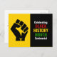 Motivational BLACK HISTORY MONTH CENTENNIAL postcard showing black raised fist graphic against a rich yellow background on the left, and CELEBRATING BLACK HISTORY MONTH CENTENNIAL in bold white, red, yellow, green typography set against a rich black background on the right. On the reverse there is a CUSTOMIZABLE greeting which you can personalize with your own wording. A great way to keep in touch over the Black History Month season—especially during this landmark centenary year. Other varieties of BHM cards, invitations, clothing and decor are available.