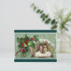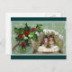 Vintage image of two kitties at a fancy dinner table on New Years Eve. Holly borders the edge of card.