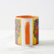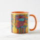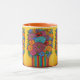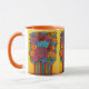 Vibrant Stylised painting of a colourful floral bouquet in a matching striped colourful vase by popular artist Lisa Lorenz on a stylish coffee mug.