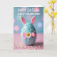 This card features a smooth, robin’s egg blue egg-shaped centerpiece topped with upright bunny ears that are white-tipped and softly lined in pink 🐰. Tiny candy-like dots and small star shapes in pale pink, white, and buttery yellow are sprinkled across the surface, giving it a sweet, sprinkled look. A shiny pink ribbon wraps around the middle and is tied into a neat bow, suggesting a gentle, gift-like gesture between close friends. Tucked into the bow is a white daisy with a golden centre, like a small floral note left with quiet affection 🌷. Along the bottom, a few round pastel treats are scattered on a blush-pink surface, echoing the same soft colour palette. The background fades upward into light sky blue with large, softly blurred circles of rose, lavender, and deep blue light, creating a dreamy glow. Near the top, short greeting text sits centred in white, standing out against the blue. The bunny ears angle slightly inward above the egg shape, with the pink inner edges clearly visible.