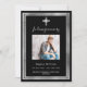 An elegant, modern, simple funeral/celebration of life program. A classic black background decorated with a faux silver cross, and faux silver frames. Personalise and add a photo name and details. White text.