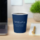 Personalise this simple minimal paper cup template on a classic blue background with the name and dates of your loved one. Classic design featuring simple black script typography on a clean white background. Perfect addition to your funeral memorial remembrance reception event. Easy to customise. Matching products available. Our heartfelt condolences on your loss.