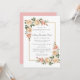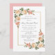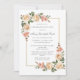 Two elegant blush pink rose arrangements decorate the gold frame to create an elegant celebration of life funeral invitation.