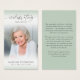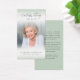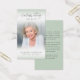 Keep the memory of your loved one close with this personalized prayer card featuring a beloved photo, the title CELEBRATING THE LIFE OF NAME, dates and an editable heartfelt remembrance message your can change to a meaningful poem, prayer, bible verse or quote. With its simple yet elegant design and modern script typography on your choice of background color (shown in sage green), it makes a cherished keepsake to share at a funeral, memorial service, visitation, wake or Celebration of Life and offers comfort and a lasting tribute for family and friends. Its small and portable size of 3.5x2" (wallet-sized) makes it convenient for loved ones to carry it with them as a reminder of your loved one’s life and spirit.