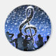 Blue,Music notes and image of people at a gathering.