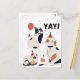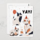 The image depicts an illustration of three playful cats celebrating a party. One cat holds a red balloon, another wears a party hat and sits next to a slice of cake, and the third cat lies down with a small gift box nearby. The background features colorful scattered dots, and the word "YAY!" is prominently displayed at the top in bold, black letters, conveying a festive and joyful atmosphere.
