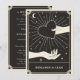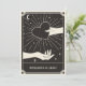 This Boho wedding invitationfeatures a celestial tarot card style design in a black and cream colour palette. The illustration shows a hand holding a heart. The background has a moon and twinkling stars. This would be perfect for anybody having a Halloween or Spooky themed wedding with a palmistry or fortune telling theme.