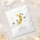Capture the magic of a starlit garden with these enchanting celestial bumblebee favour bags, a perfect choice for a whimsical spring baby shower. The design features a golden crescent moon dripping with honey, entwined with delicate green vines and surrounded by tiny stars and happy little bees. This garden theme blends celestial wonder with a fresh, seasonal feel against a clean white background. A personalised name and event date at the bottom add a professional, custom touch to your celebration. These high-quality bags offer a delightful and unique way to share small treats or keepsakes with your guests, ensuring your special day feels truly out of this world.