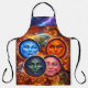 Up some magic in the kitchen with this stunning celestial chaos apron this high detailed fantasy design features for vibrant moon faces representing the elements set against a dramatic backdrop of lightning strikes, fiery dragons and a witch at her cauldron from the winking pink moon to the stern orange sun face this apron is a masterpiece of Gothic art and supernatural energy perfect for the mystical baker the Halloween host or anyone