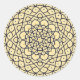 A lace-like concentric circle mandala in dark blue with bright blue and gold star-like dots spangled among the layers makes for a fun, design that brings to mind a starry night sky.