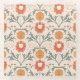 A seamless pattern featuring stylized sun faces, blooming orange flowers, curling clouds, and leafy green vines on soft beige background.