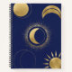 Celestial gold sun moon phases eclipse on a purple blue background. Choose from sketchbook, bullet journal, checklist, graph paper, recipe book, or lines in various widths and colours. Also choose a spine colour to further customise your notebook look.
