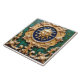 Golden sun with a human face set in a circular golden frame of stars, ornate golden decorations, dark blue circle, green marble background.