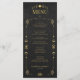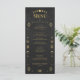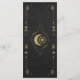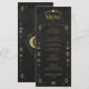 This Celestial Gothic black and gold wedding menu card features elegant moon phase detailing and structured geometric celestial accents in antique gold on a rich charcoal background.