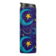 blue, crescent moons with bright, yellow stars, on a dark blue background