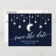 Celestial Save The Date engagement announcement postcard. Modern Calligraphy Script. Watercolor blue night sky with stars and the moon. Bokeh string lights.