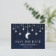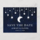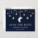 Celestial Save The Date engagement announcement postcard. Watercolor blue night sky with stars and the moon. Bokeh string lights.
