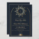 This design features navy blue and golden celestial art including bohemian linear wavy sun logo and arch frame personalised wedding invitation. This product can be easily personalised. If you need help with the customisation of the product or need matching products kindly please contact me via Zazzle.