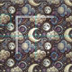 The image presents a seamless, repeating pattern with a celestial or astrological theme. It features stylised illustrations of moons, stars, and clouds in a rich, dark colour palette with hints of gold, purple, and blue. The moons are depicted with detailed textures and ornate designs, while the stars vary in size and shape, some with radiating lines. The clouds are rendered with swirling lines and a whimsical quality. The pattern is densely packed and evenly distributed, creating a visually rich and mystical design. This pattern is suitable for various applications, such as textiles, wallpapers, and digital backgrounds, especially those aiming for a celestial, mystical, or artistic feel.