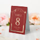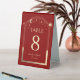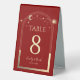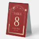 Celestial Dark Red Gold Sun Moon Stars Elegant Wedding Table Numbers Table Tent Sign features a gold sun, moon and stars frame on a dark red background. Inside is your custom table number information. Designed for you by Evco Studio www.zazzle.com/store/evcostudio