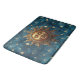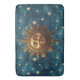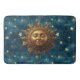 Amid a starry celestial background, the serene face of a stylised golden sun.