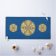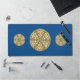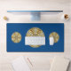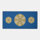 A lace-like concentric circle mandala in dark blue with bright blue and gold star-like dots spangled among the layers and a bright sunburst gradient circle behind makes for a fun design that brings to mind a starry night sky and a bright sunny day with one image.