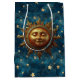 Amid a starry celestial background, the serene face of a stylised golden sun.