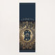 Ancient celestial sun moon faces yoga mat, personalised with your name in a flourished decorative type, on a midnight blue background. Bold and ethereal.