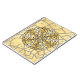 A lace-like mandala in dark blue with bright blue and gold stars and a bright sunburst gradient circle behind makes for a fun, design that brings to mind a night sky and sunny day with one image.