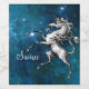 Beautiful vintage heraldry style unicorn illustration set on celestial skies background. Customise with name or other text in white script font.