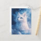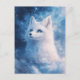 This ethereal postcard features a majestic white fox with captivating, deep blue eyes. The artwork is rendered in a dreamlike, painterly style, where the fox's soft white fur blends seamlessly into a cosmic background of swirling indigo and cerulean clouds. Shimmering stardust and golden light particles dance around the fox, creating a magical atmosphere of celestial wonder. The cool color palette of navy, icy blue, and luminous white evokes a serene winter night in a far-off galaxy. This postcard is a perfect choice for sending a soulful message, an inspiring greeting, or as a striking piece of miniature wall art for fantasy and nature lovers.