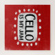 "Cello Is My Jam" is a fun text design with a white accent shape surrounded by white whimsical textured dots.