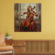 A young blonde woman in a flowing red dress plays a cello gracefully by a sunlit window, captured in soft, impressionistic brushstrokes evoking timeless elegance and musical passion.