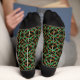 This pair of holiday patterned socks features a design of interlocking ribbon like shapes inspired by Celtic knot artwork along with wreaths of holly leaves and berries all in a traditional Christmas colour combination of red and green with golden yellow accents.