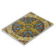An elaborate compass made of Celtic knotwork, printed in silver and copper metallic colour accents on the face and corners as well. Degrees are marked off from 10-90 in each quadrant. Around the compass, all four cardinal points are labelled in engraved-looking Irish-Gaelic on brass colour plates, subpoints are labelled in Irish-Gaelic, and twelve elemental points as well: earth, storm, lightning, metal, air, sun, wind, wood, water, fire, spirit, stone. Also, subtle, decorative rune work decorates an inner ring.