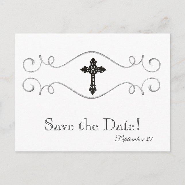 This postcard is an affordable way to let guests know about your upcoming event. Featuring silvery grey swirls and a black celtic cross.