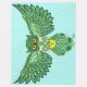 Green Celtic knot work owl with open wing span in a backdrop of teal.