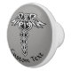Double snake caduceus. Image inspired by celtic knot design. Vector icon with custom colour. Custom background colour. Custom text.
