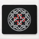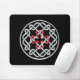 A mousepad with a Celtic knot design with a red square cross in the center.