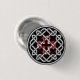 A round button with a Celtic knot design with a red square cross in the centre.