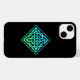An iPhone 14 Case of a blue-green Celtic knot diamond design against a black background.
