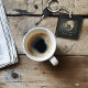 An aerial view of a small cream coloured dragon resting atop intricate Celtic knot work carved in tones of brown, black, and grey stone. Set against a deep black backdrop.
