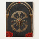 Celtic knots and a heart in Gothic elegance. Gothic-inspired frames comprise elegant golden arches and columns reminiscent of Gothic cathedrals. These elements are finely crafted and decorated with intricate Celtic knot patterns. A winged heart emblem, set with vibrant red jewels, sits enthroned in the upper centre of the frame. The bottom of the frame is dominated by a golden skull design, symbolising both strength and mystery.