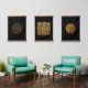 A set if three intricate celtic knotwork designs, a Celtic Knotwork Cross, and Triple Celtic Swirld Knotwork Mandalas with eternal spirals and trinity knots , in gold and black on an ancient parchment.