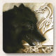 Black lone wolf with celtic knot work and dragon on wall behind.