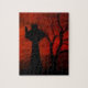 Have fun assembling this puzzle of a dark red scene with a black crow on a Celtic cross.