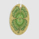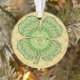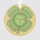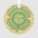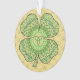 This classic four leaf clover overlays a concentric circle design featuring layers of Celtic weaves in multiple shades of green with a bit of orange for accent.