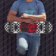 It's the symbol of a dragon in Celtic style with a quote from Shakespeare's 'King Lear'. You may edit the colour of the dragon and edit or delete the text. You may also change the white background colour for a different chequered combo. The circle with the dragon and the text's rectangles may also be recolored.